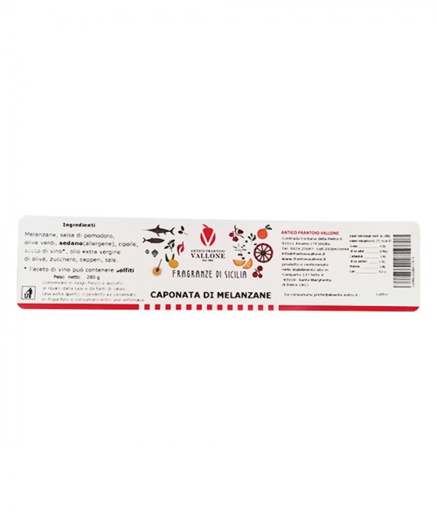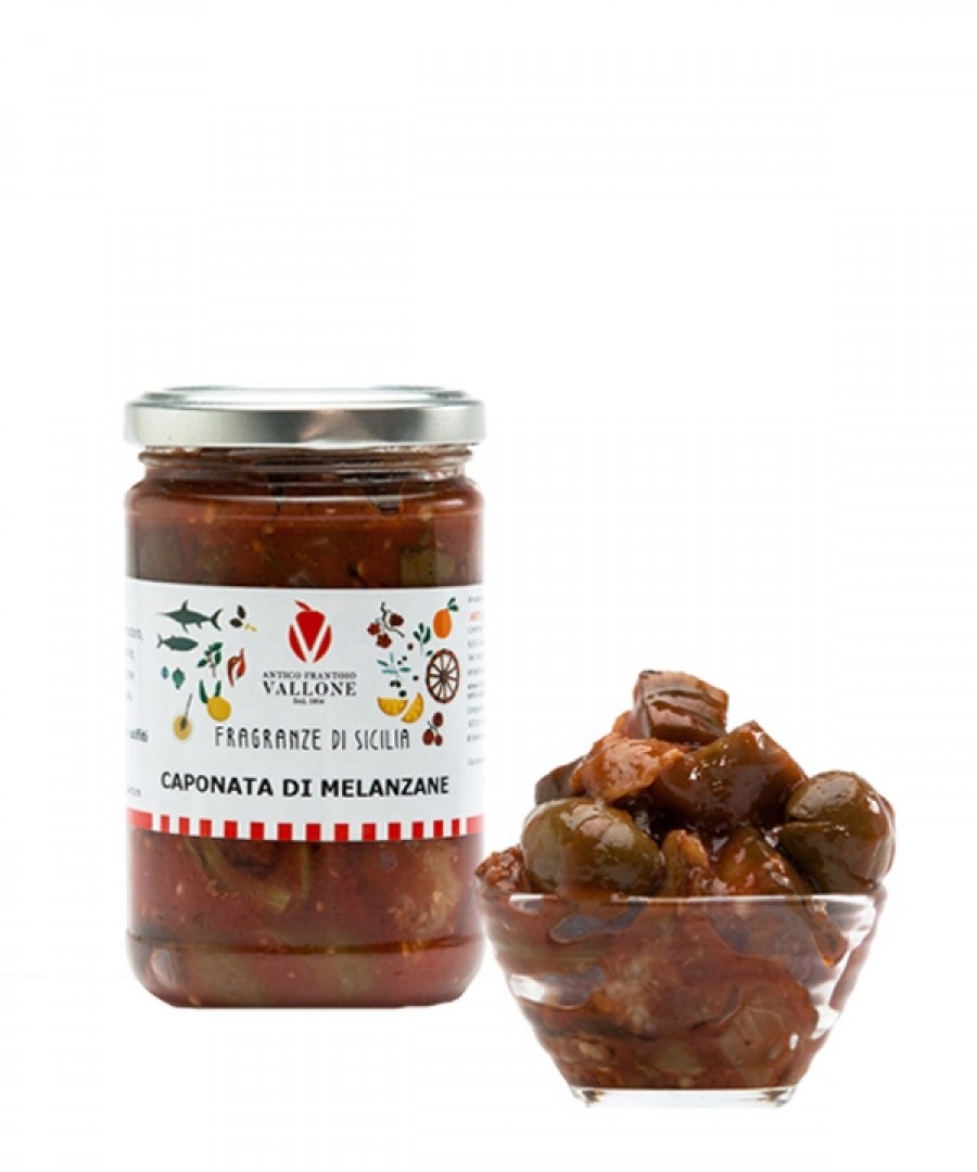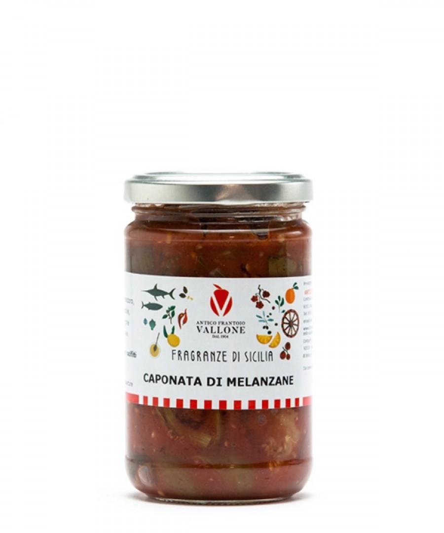 Typical dish of Sicilian cuisine, used as an appetizer or side dish. The Vallone company eggplant caponata, prepared with a lighter recipe, reduces the presence of fried oil and supplements with Extra Virgin Olive Oil after cooking.